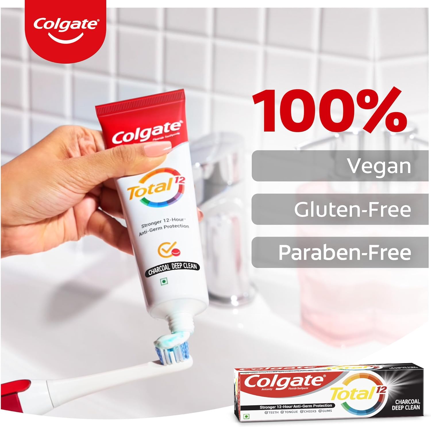 Only 20% of the germs in your mouth are on your teeth, the rest 80% are on gums, tongue and cheeks. Colgate Total Charcoal Deep Clean is an antibacterial toothpaste with dual Zinc arginine technology that actively seeks out bacteria and fights germs on teeth, tongue, cheeks, and gums, giving you Whole Mouth Clean for 12 hours. It is infused with micro-charcoal particles to provide a deep clean. Colgate Total provides more benefits than before - helping prevent cavities, plaque build-up, tartar formation, gingivitis and sensitivity. It gives you fresh breath , protects your enamel, and removes stains, giving you a healthier, whiter smile Colgate is India's Most Trusted oral care brand and is IDA certified. This toothpaste is 100% vegetarian, sugar-free and gluten-free and responsibly made.This toothpaste is made in India, in our manufacturing unit that is awarded with True Zero Waste Platinum Certification