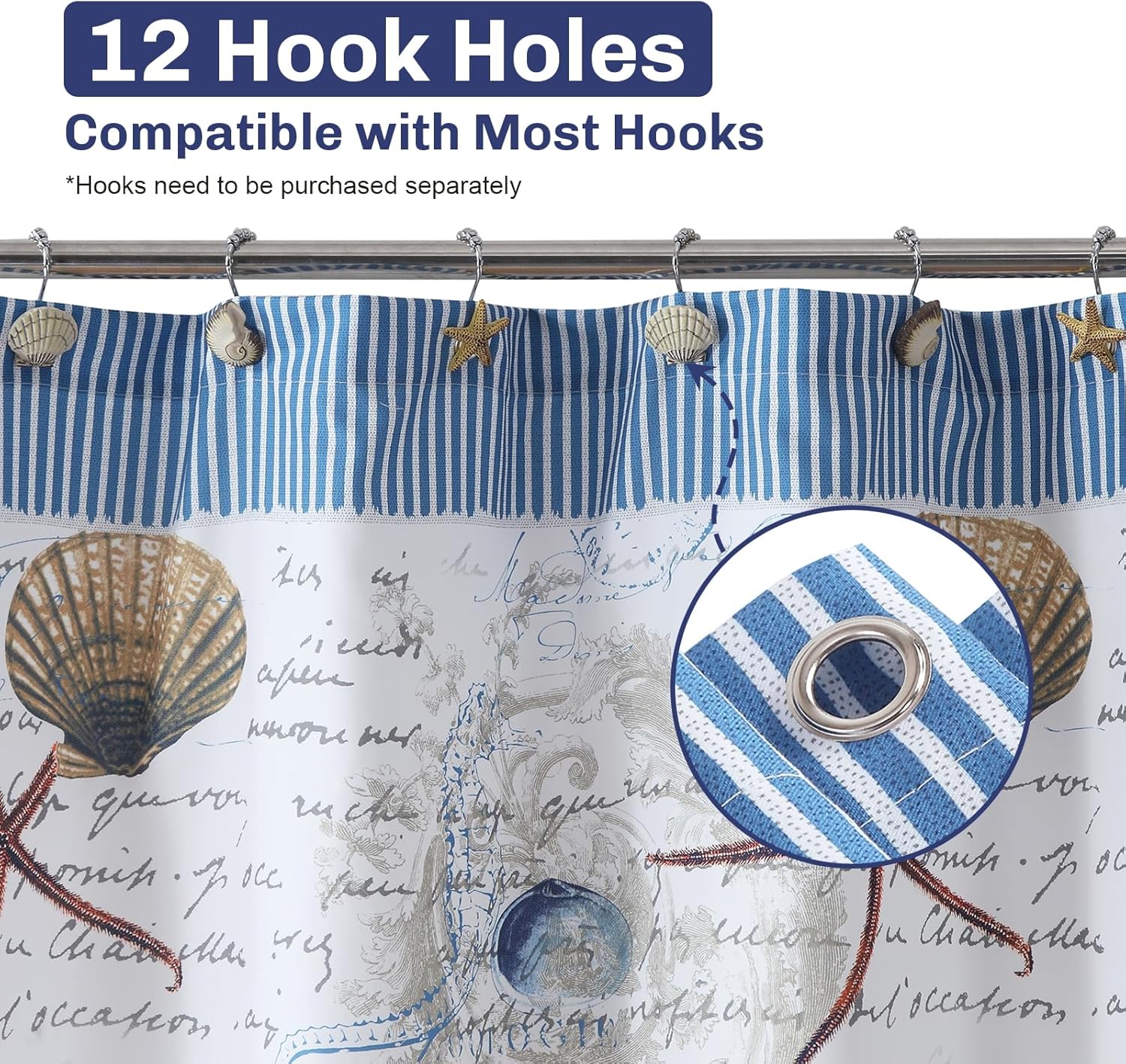 SD SDLIVING Ocean Themed Shower Curtain, featuring seashell and starfish motifs that evoke the leisurely charm of coastal living. The blue print infuses your bathroom with refreshing vitality. Crafted from premium waterproof fabric, it resists deformation and fading in machine washes for effortless daily care. Compatible with various shower spaces, installation is quick and simple. Whether creating a seaside-inspired bathroom, achieving wet/dry separation, or serving as a room divider or dust curtain, this shower curtain is the perfect choice. Refined details and practical design add comfort and beauty to your home life.